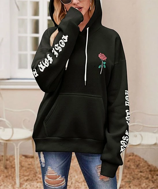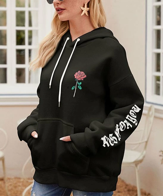 Swap that old stained sweatshirt for this trendy hoodie designed with stretch-infused fabric and a rosy motif for comfortably casual style.