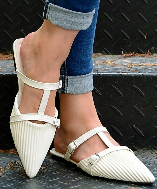 This chic flat features a versatile neutral hue and a supportive T-strap design.