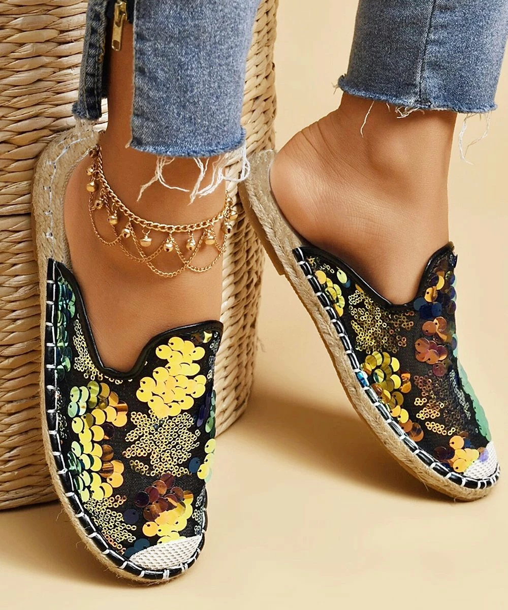 A sheer upper adorned with vibrant sequins creates an airy and comfortable feel, while an espadrille design adds a touch of beachy style.