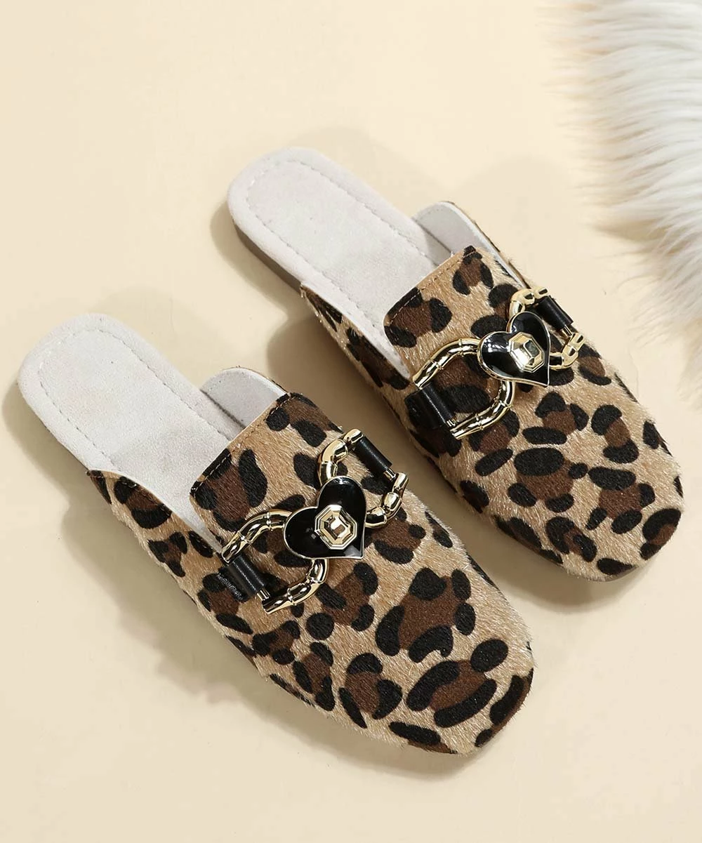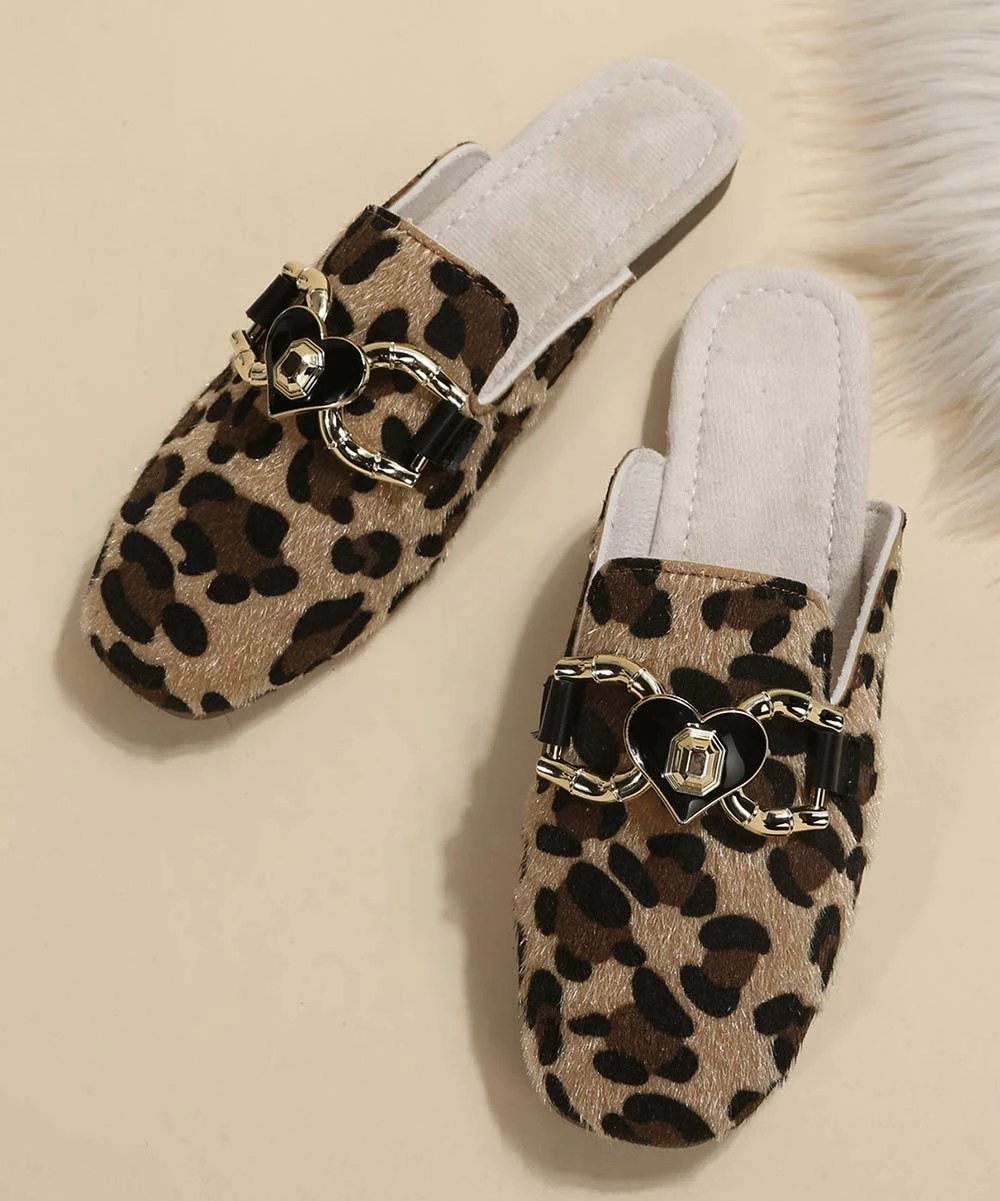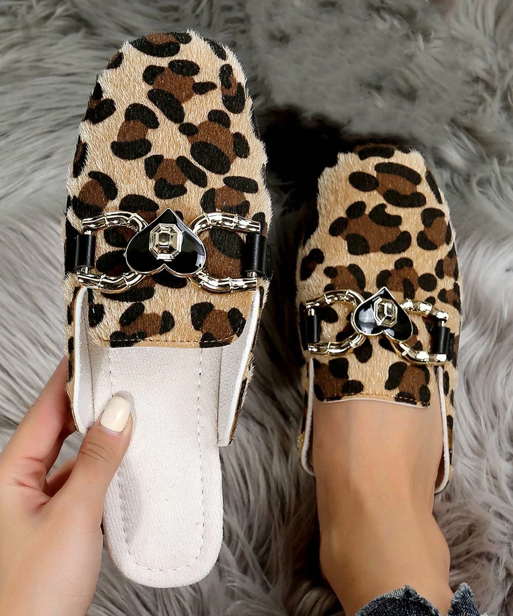 Slip into these leopard print mules that feature a soft insole and goldtone bit on the upper for added flair.