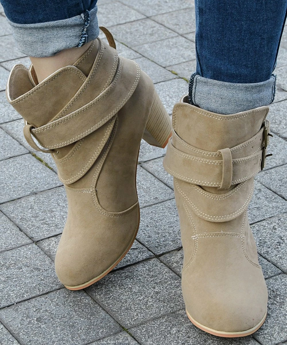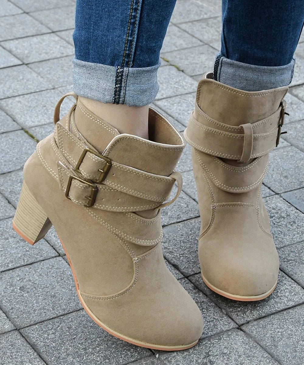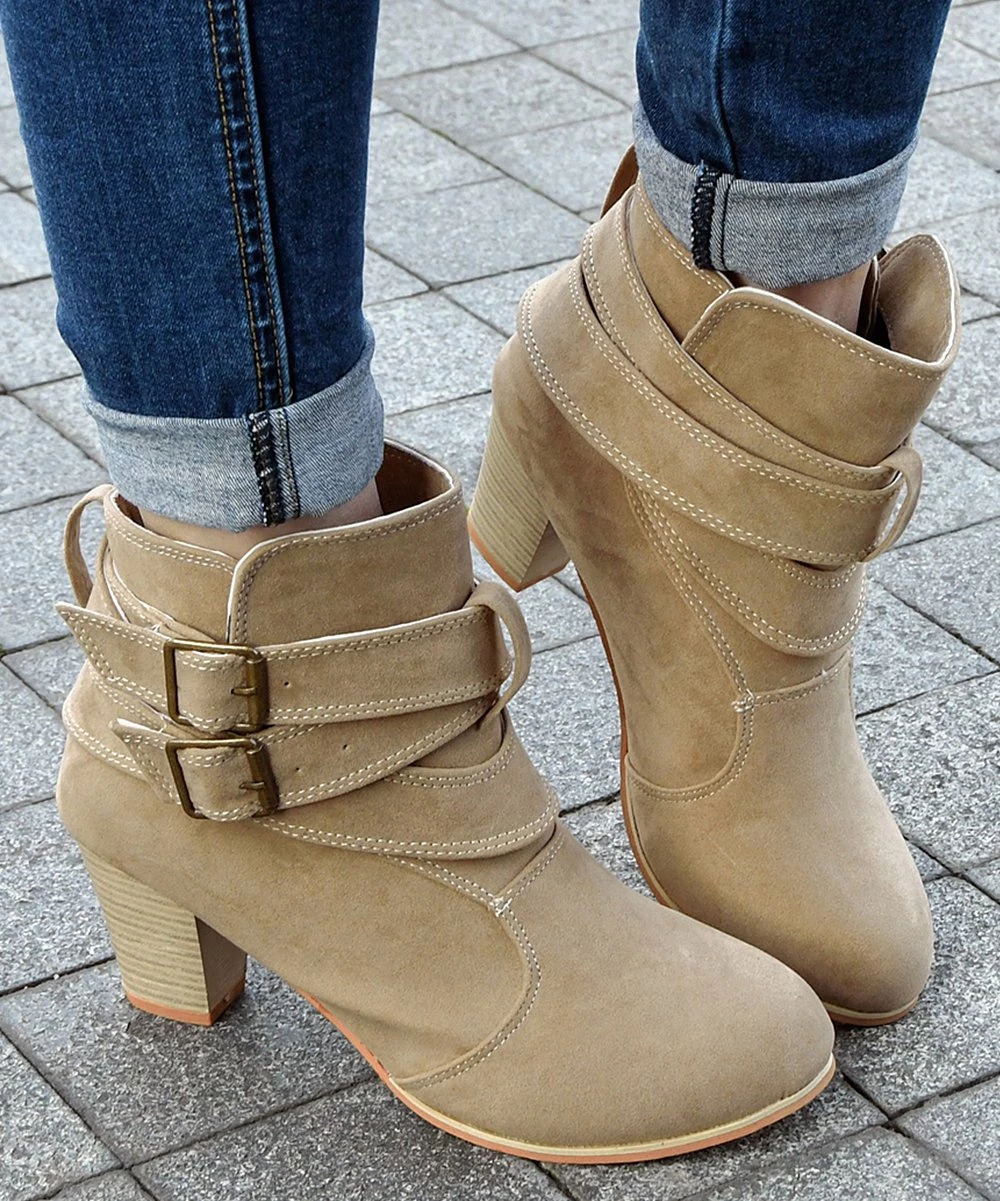Take to the streets in style when you pull on this bootie boasting a faux suede upper with double buckle accents, block heel and sturdy rubber sole.