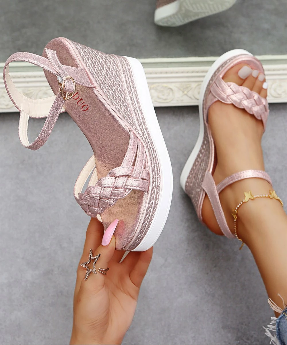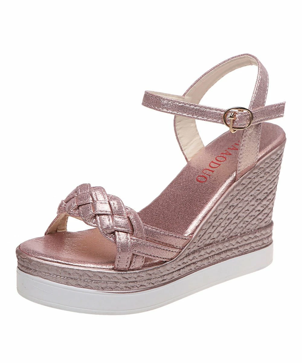 Glittery straps and a braided accent make this sandal just the thing for your warm-weather wardrobe. Tall heel makes sure your look stands out.