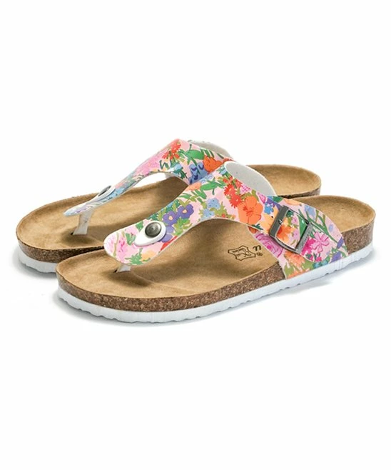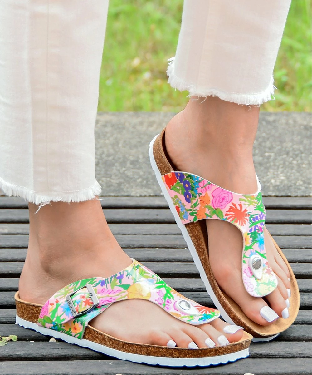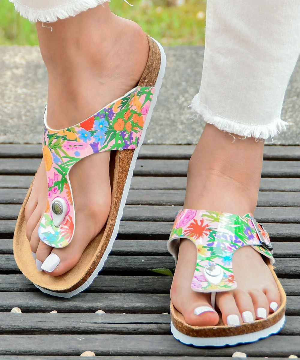 Sandals featuring a vibrant floral print and a classic T-strap design.