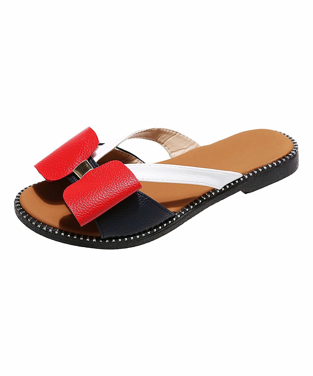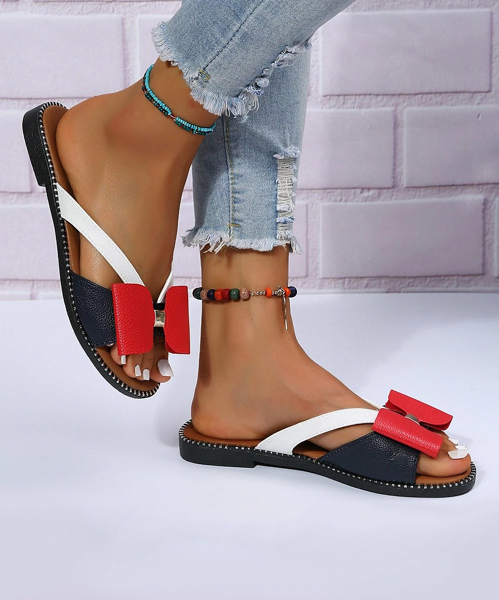 Casual sandals with a bow accent on the upper and contrasting white strap accents. Exposed stitch detailing.