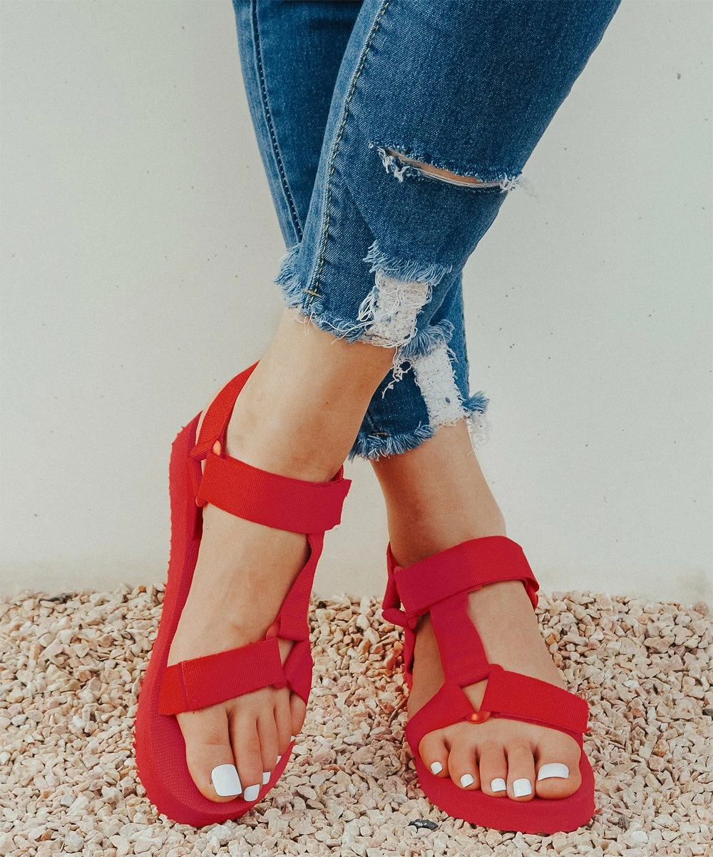 Get the retro look you love from these rubber-soled sandals that feature a sporty web of straps connected by triangle accents.