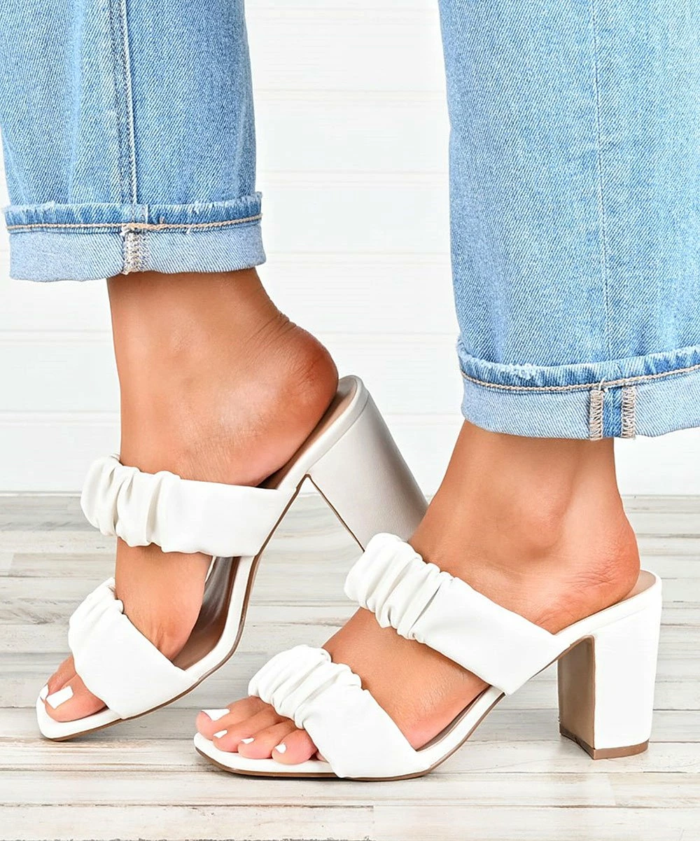 Keep your sunny day looks simple with this block-heel sandal boasting matching gathered straps.